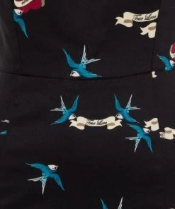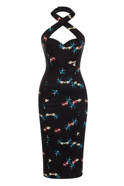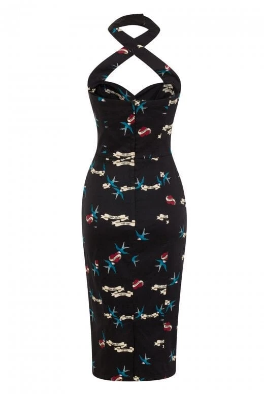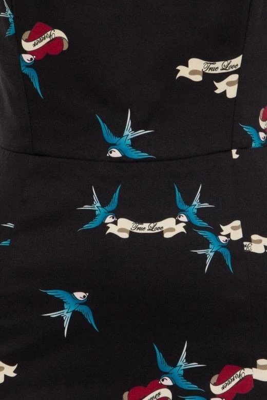 The Penny True Love pencil dress is a form fitting piece made from stretch cotton, printed with a classic bespoke pin-up print; illustrated with adorable blue birds unravelling scrolls with the phrase ‘True Love’ and red hearts displaying the word ‘Forever’. Penny features a delicate sweetheart neckline with cross-over straps, wrapping around the nape of the neck that fastens with adjustable hooks. She secures with a centre back auto-lock covered zip, finishes just past the knees and contains a centre back vent for a little wiggle room.