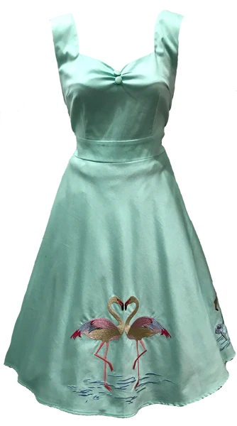 The stylish Natalie dress features a fitted flattering bodice, flirty sweetheart neckline, a gathered bust with button detail, concealed side zip and a 50’s style full circle skirt. The mint green background complements the stunning pinks in the flamingo embroidery.The gorgeous vintage cocktail dress is made from a lovely soft cotton with stretch and sits just below the knee.
