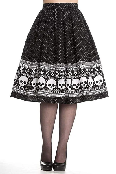 A high waisted pleated, festive skirt with a skull border print.