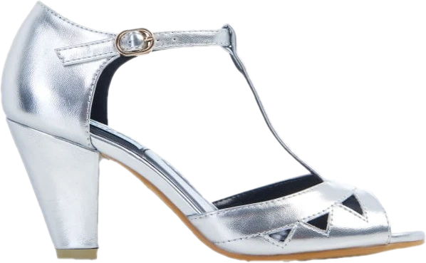 The Veronica High Heel is a fun piece. She is a classic peep toe style, with pointed shaped front to add true vintage details. She has a classic T bar, fastening at the side with a metal buckle. Veronica is made from a gorgeous silver metallic PU, with triangular cut outs along the front. Her block heel makes her much more comfortable than stiletto styles, so you can dance the night away! She has a fun print lining, peeking out at the peep toe. Pair yours with Tropical printed dresses for a vintage-inspired ensemble. Also available in gold.