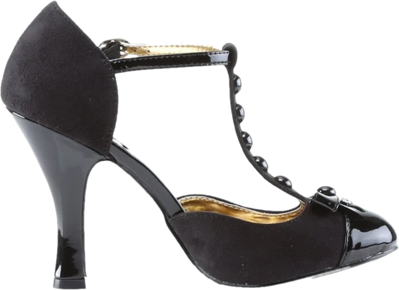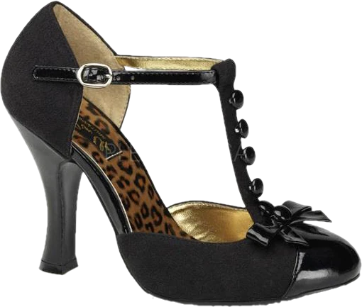 A classy black suede and patent shoe perfect for special occasions. It has a 10cmåÊheel and a t-strap with button detailing. A sweet mini bow completes the look. From Pin Up Couture and made from PU, with a PVC insole and rubber sole.