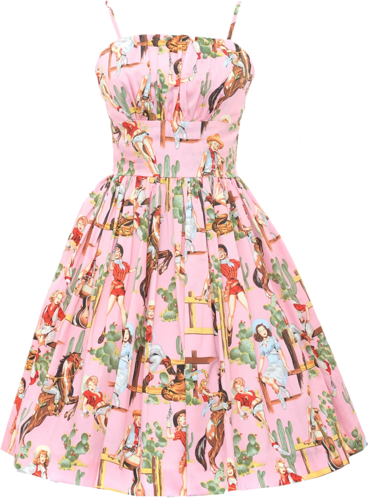 Giddy up! This sunny cowgirl dress by Retrospec’d has such a fun print. Made from cotton twill with adjustable straps, the cowgirl sundress will be sure to be lassoed quickly.