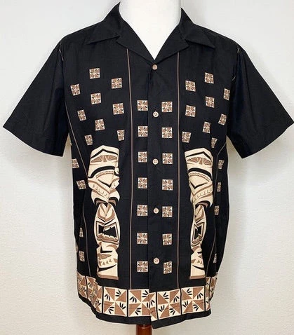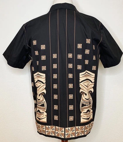 This shirt features the artists take on the God of War. Featuring a wooden tiki as well as a border print reminiscent of traditional island tapa cloth, this versatile shirt offers an authentic look with all the comfort and convenience of modern rayon fabric.